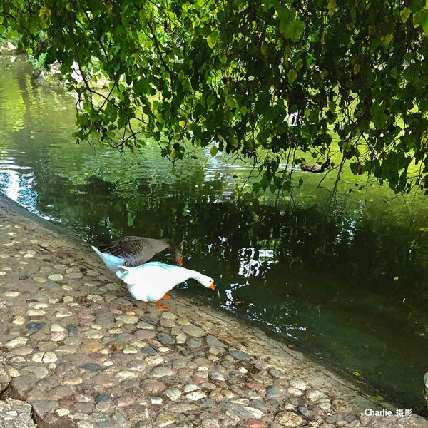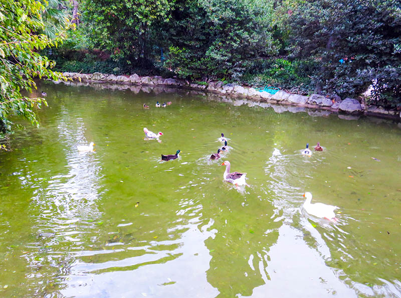 花园里有一个小水塘,各种各样的鸭子在欢快的戏水。