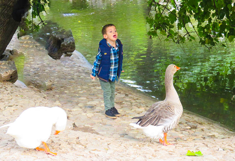 可爱的小男孩儿也想像鹅一样昂首挺胸,嘎嘎地叫。