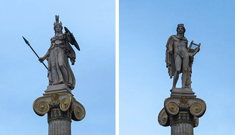主楼外面的两个柱子上,分别雕刻着身着盔甲的雅典娜(Athena)和手持乐器的阿波罗(Apollo)立像。