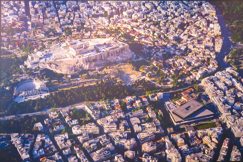 进入大厅,导游让我们注意墙上的一幅大照片,告诉我们,照片上右下角就是这个新博物馆。而在左上边和博物馆相对的,就是卫城最重要的建筑帕特农神庙。博物馆的方向,形状,以及长、宽都与神庙相等。这其中的奥秘我们将在展馆中发现。