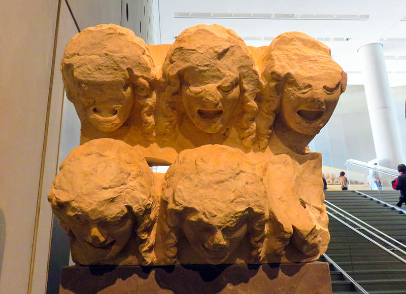 一组戏剧面具雕塑,可能是装饰舞台用的。但也足以展示古希腊人的戏剧情结。那么多大型豪华剧场可不是白盖的,就连戏剧面具都被制成雕塑装饰品,可见古希腊人演剧情结是真格的,渊源颇深啊。