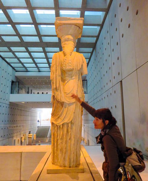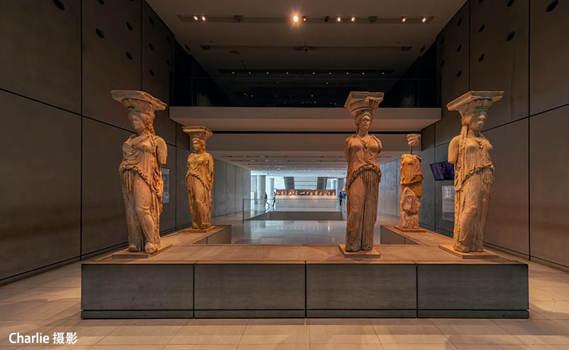 这里展示的是经过清洗的卫城著名的厄瑞克忒翁神庙的女像柱。就是用6尊少女雕塑当作石柱。这几尊少女像是真品,而外边神庙的女像柱则是仿制的。