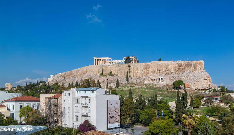透过整面墙大小的360度玻璃窗,可以清晰地看到对面山上的帕特农神庙。