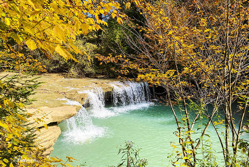 瀑布的水流入一个翡翠色水池,颇为奇特。