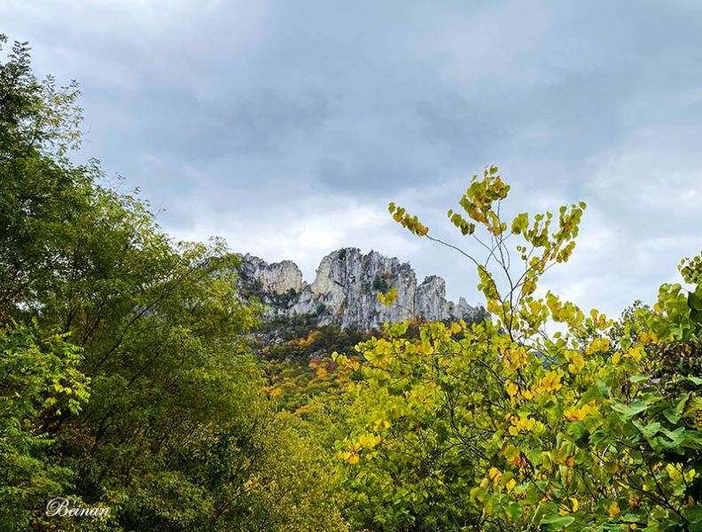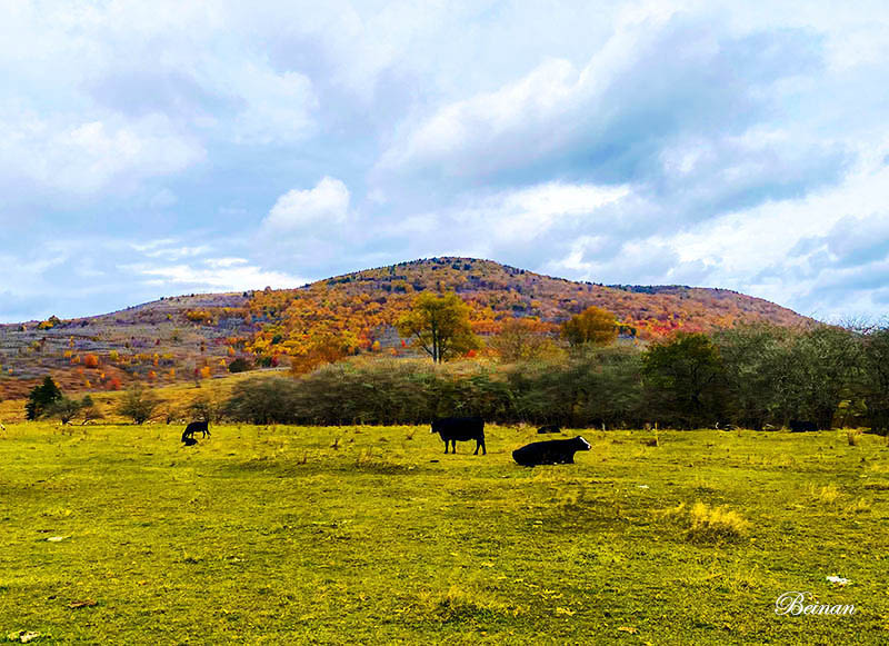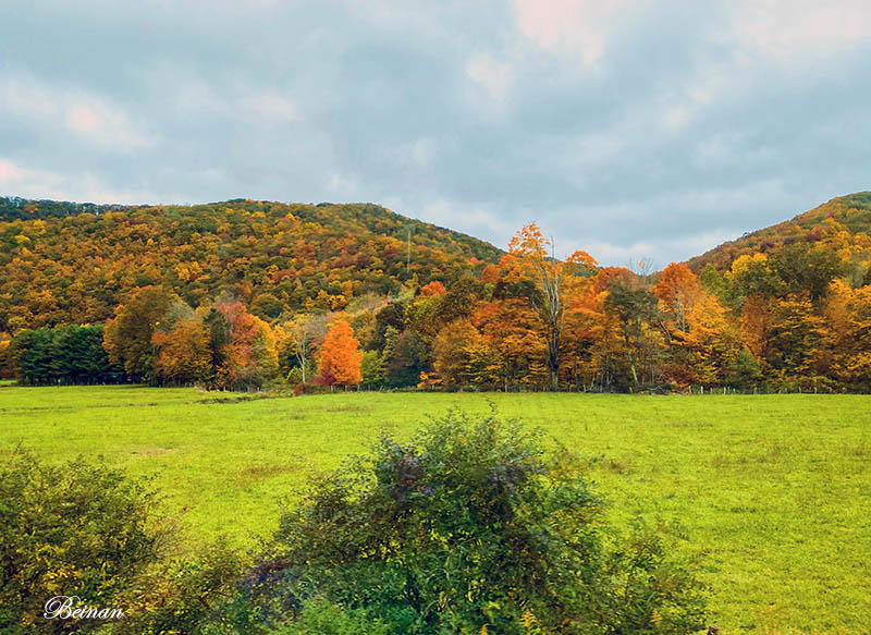 后来车子驶进了峡谷,乡村路两旁树上的秋叶遮住了天空,仿佛驶进了金色的隧道。路的一侧是山壁,另一侧是峡谷。峡谷里是平坦的绿色草场,草场的另一边是层林尽染五彩斑斓的山坡。。。