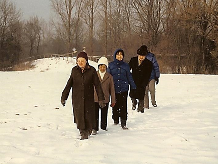 周末,我们宴请房东太太。加兴的中国学者老张也来凑热闹。我们在房东的厨房里摆开阵势,大家各显身手,烧了一顿丰盛的中国菜。房东太太对中国菜赞不绝口,大家吃得很尽兴。饭后,房东太太兴致勃勃地带着我们,外出踏雪游玩。