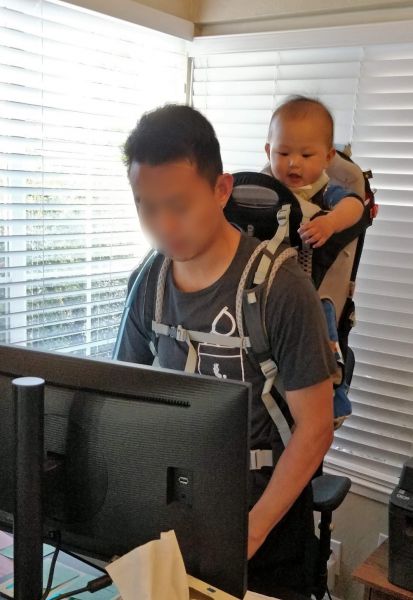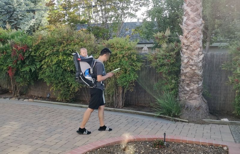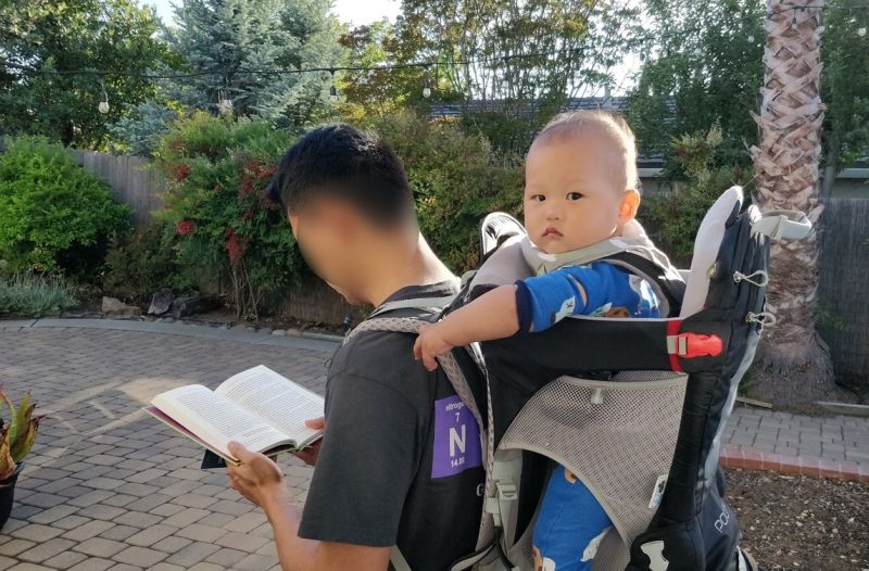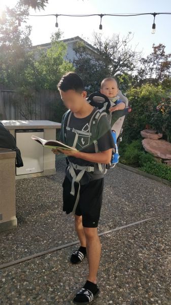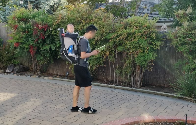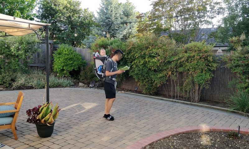 小小阿立不甘落后,后院里背篓散步不忘一卷在手: