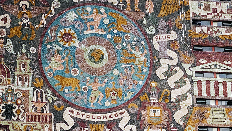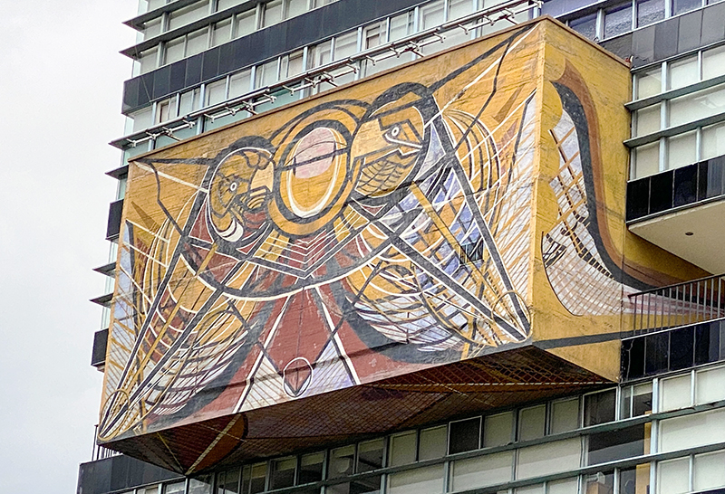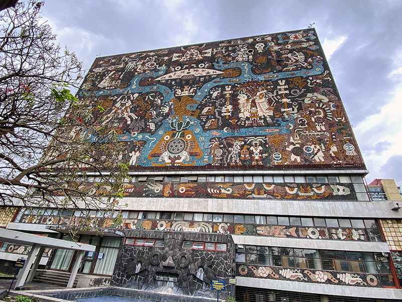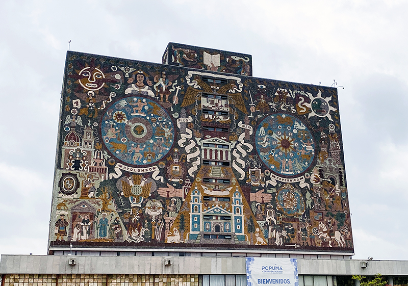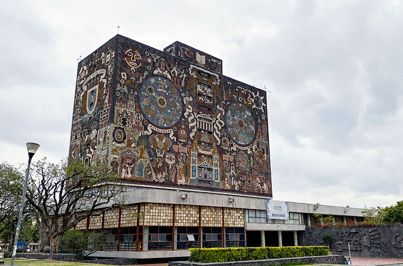 最引人注目的就是这座十层楼的中央图书馆了。图书馆四面都覆盖着由墨西哥艺术家 Juan O'Gorman 创作的文化历史代表壁画。