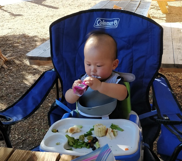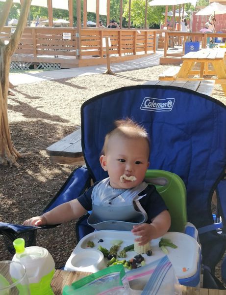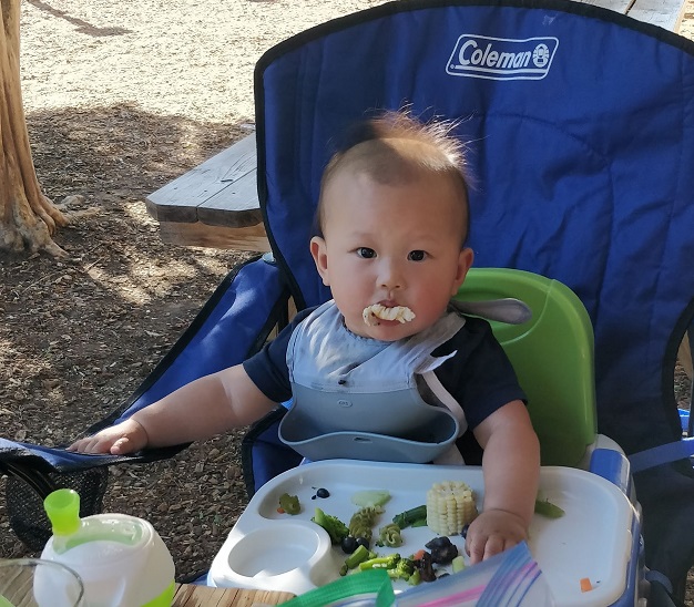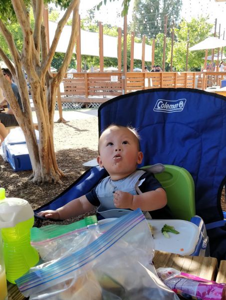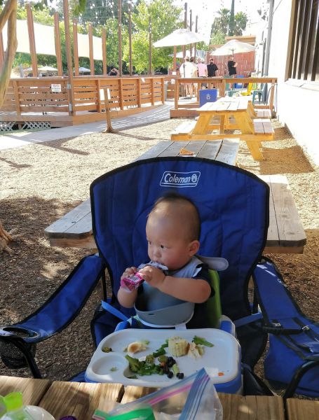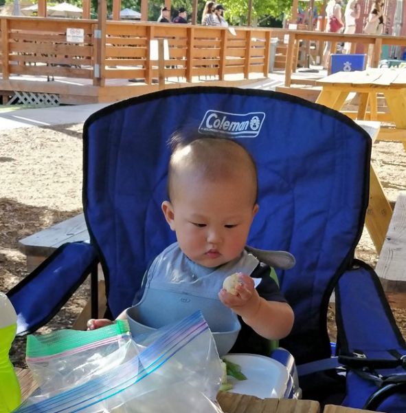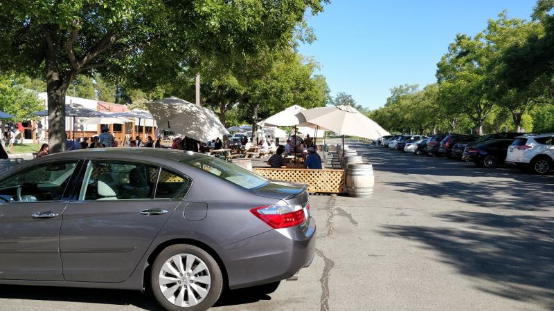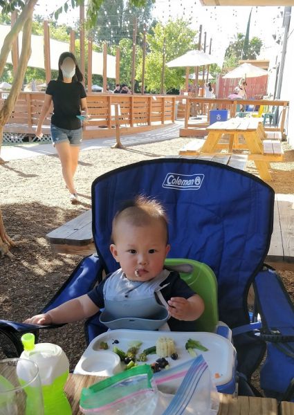 停车位虽然还有。有遮阳棚或在树荫下的桌子都有人了。就是阳光普照的长条桌也只有一张空的了。只好先占了座再说。