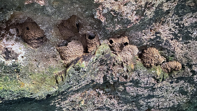 我们没带泳衣泳裤,只好看着人家凉快。“王大明白”发现了洞顶的无数燕子窝。
