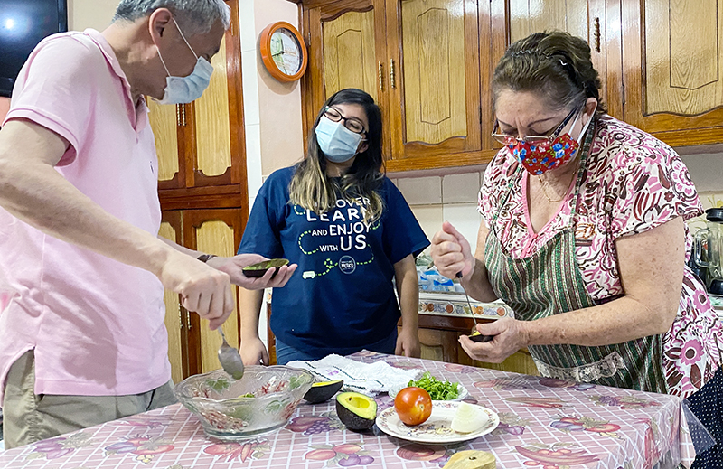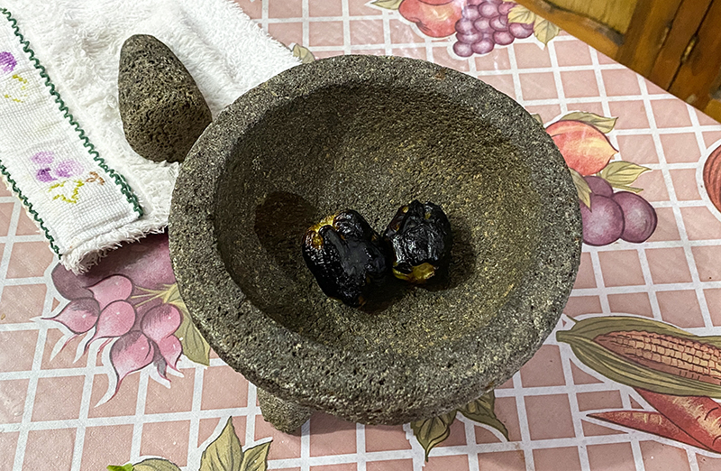 女主人将两个辣椒用锡纸包了,在火上烤,然后放在捣蒜臼里捣碎,一股辣味顿时充满厨房。好在我们都带着口罩,没有太呛着。