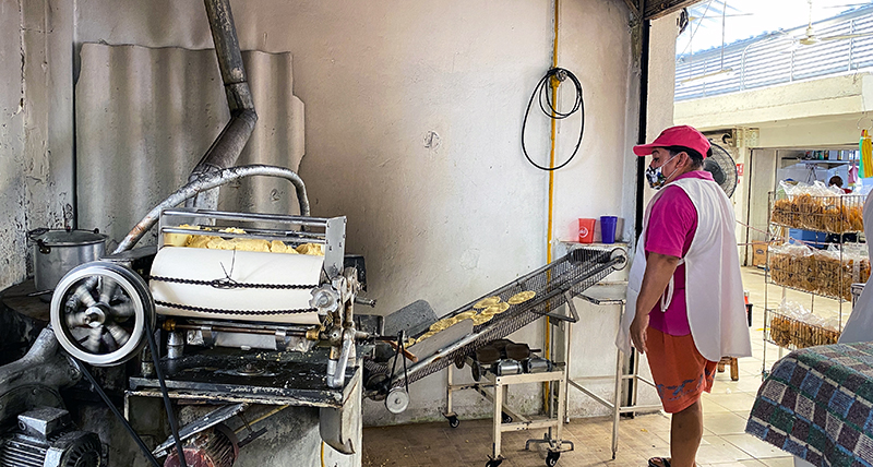 将和好的面放在机器里,压成同样大小的圆饼,烤熟,出来就是taco啦。
