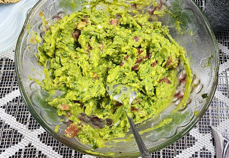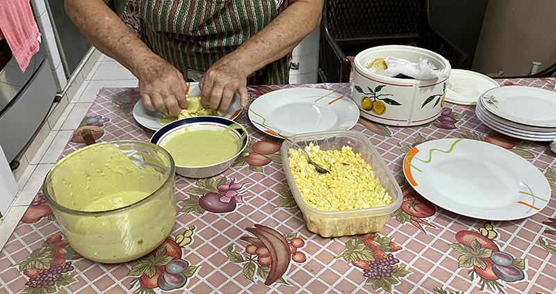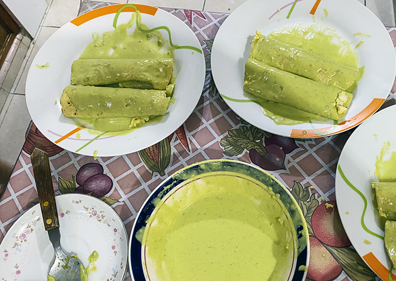 女主人在做主食。用玉米饼taco卷上捣碎的鸡蛋,然后放在南瓜子粉做成的汁里蘸一下。这会儿知道导游买的南瓜子粉怎么吃了。