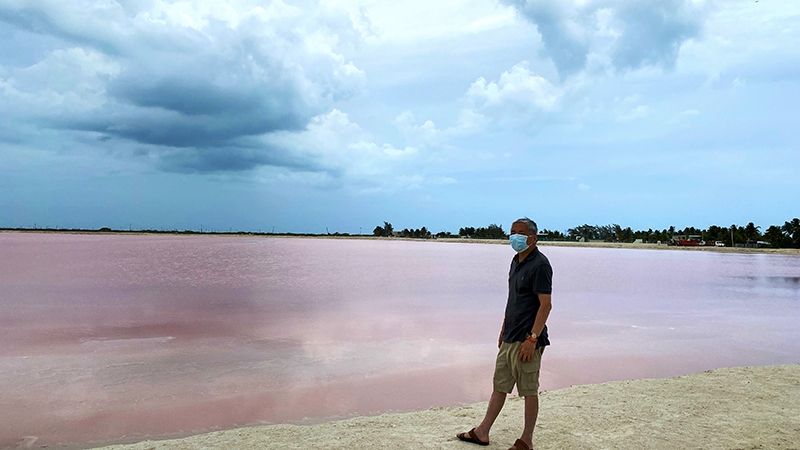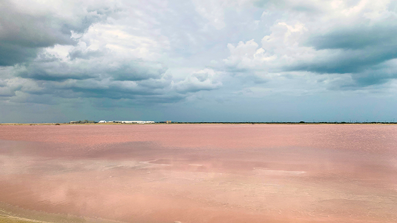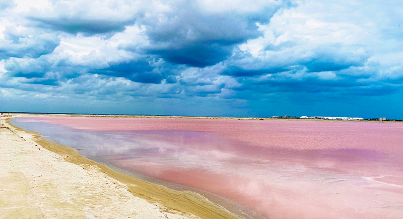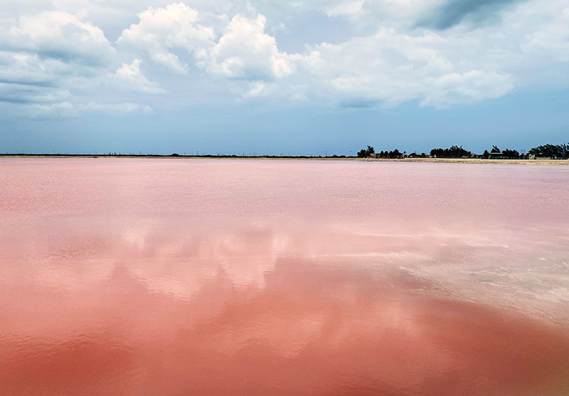 天气特别给力,厚重的乌云在湖的上空翻腾,遮住了强烈的阳光,云朵映照在水中,在粉红色的湖面上又增加了几分浓墨。