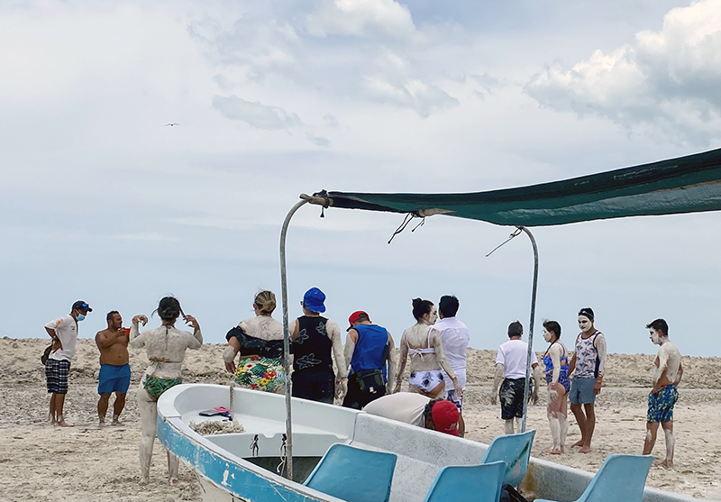 在大鸟的簇拥下,小艇靠在河中的一片陆地上。导游让大家都下船,往身上抹白泥,说这种白泥含有高浓度的矿物质、盐、硫、和藻类,对皮肤特好,这是有名的玛雅浴。