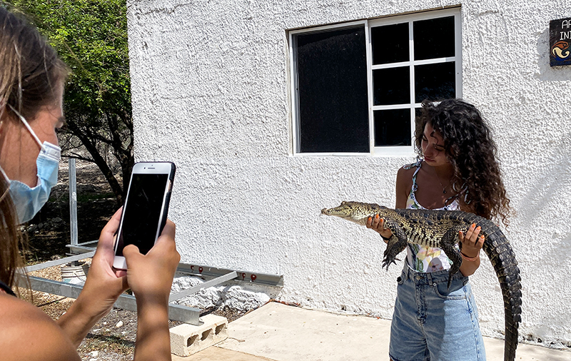 美女们争着抱小鳄鱼拍照,弄得老太鸡皮疙瘩掉了一地。