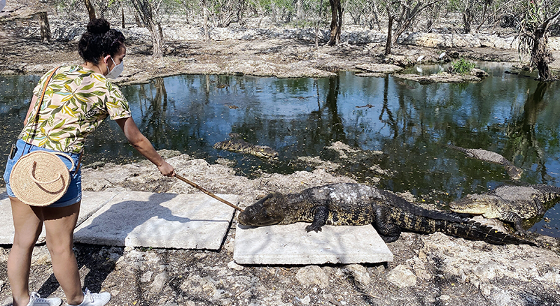 又在肮脏的鳄鱼塘边战战兢兢的喂鳄鱼拍照。
