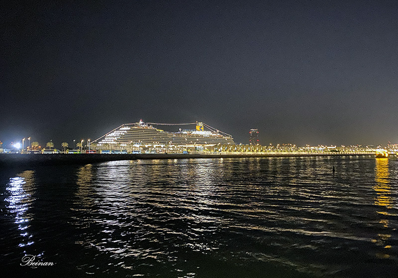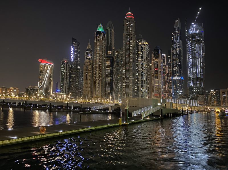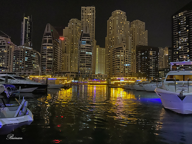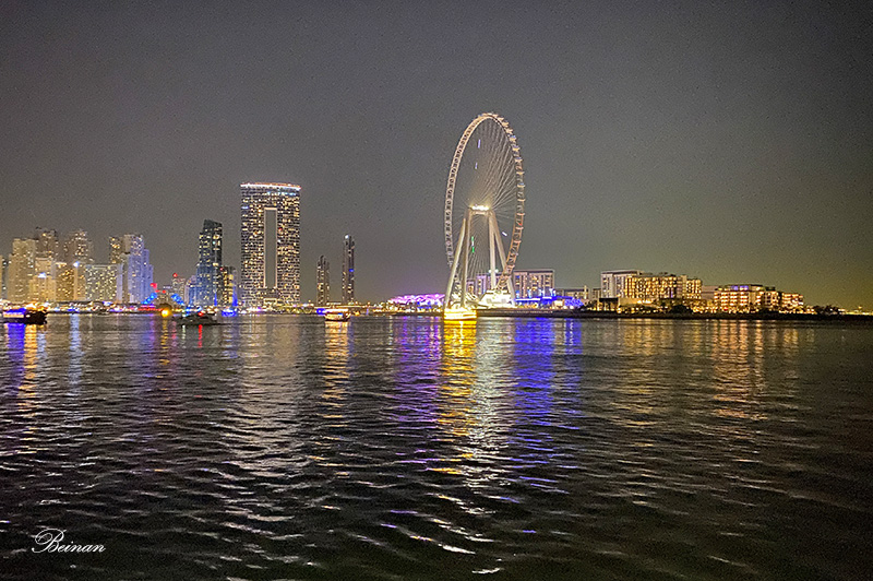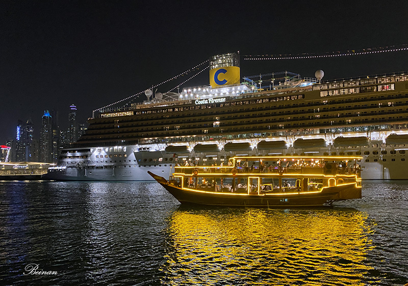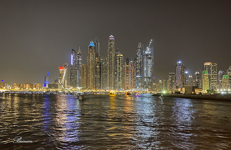 晚餐后,登上甲板,在凉爽的晚风中观赏迪拜码头的夜景。