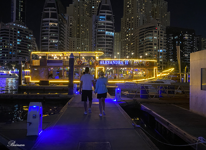 在迪拜的第二天晚上,旅行社安排了在迪拜码头(Dubai Marina)的一艘木船上的晚餐。