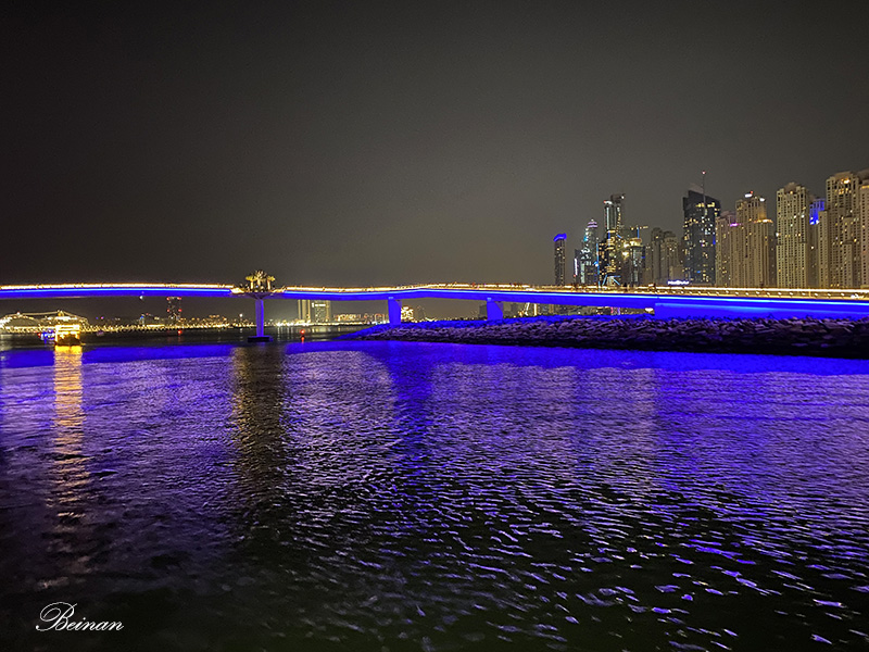 那蓝色荧光灯映照的是连接波斯湾港口两岸的桥梁。后来,我们有幸在桥上漫步,在白天看到了它的“庐山真面目”。