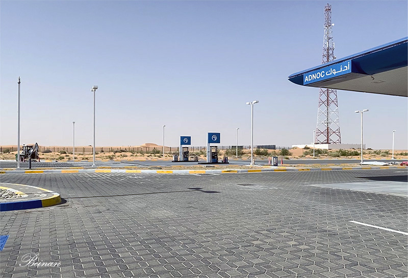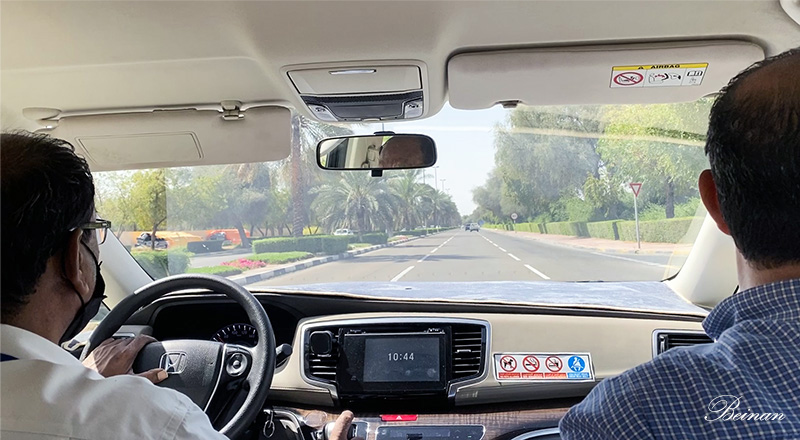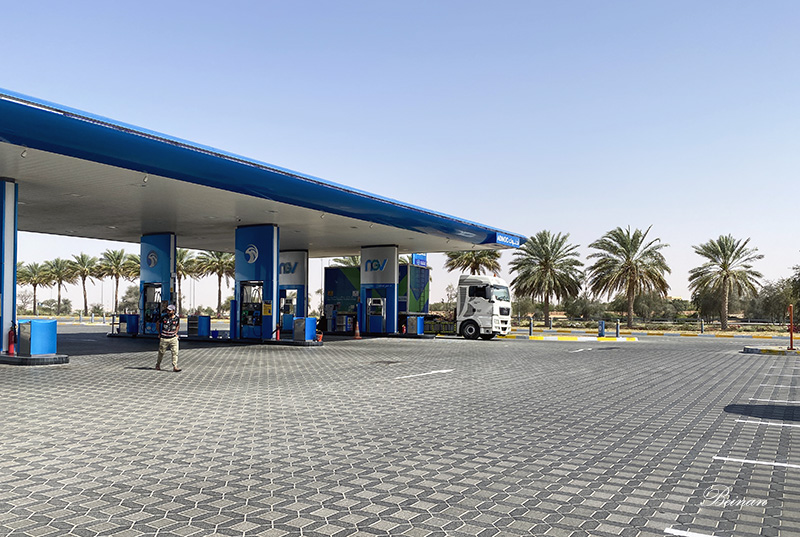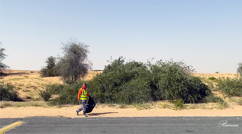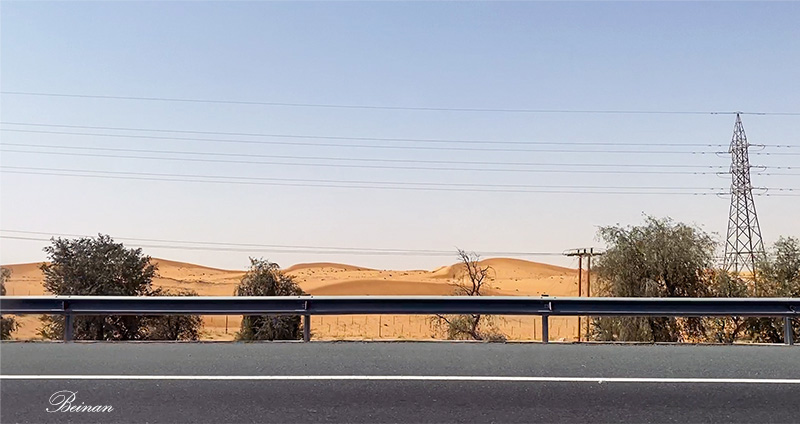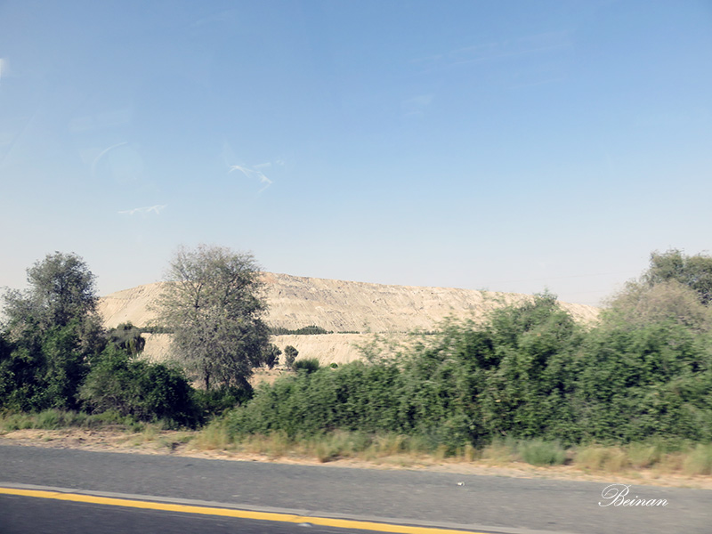 从迪拜到艾因(Al Ain)大约有150公里(93 英里)。高速公路路况非常好。公路两旁有绿色的植物,可以看出是长在沙丘上的。还有工人在清理垃圾。
