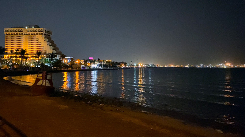 海滨的夜景很美。使我们感到惊奇的是,已经将近午夜,海滨还是很热闹。停车场几乎找不到车位。有许多穿黑袍带面纱的妇女带着孩子在游乐场玩耍。
