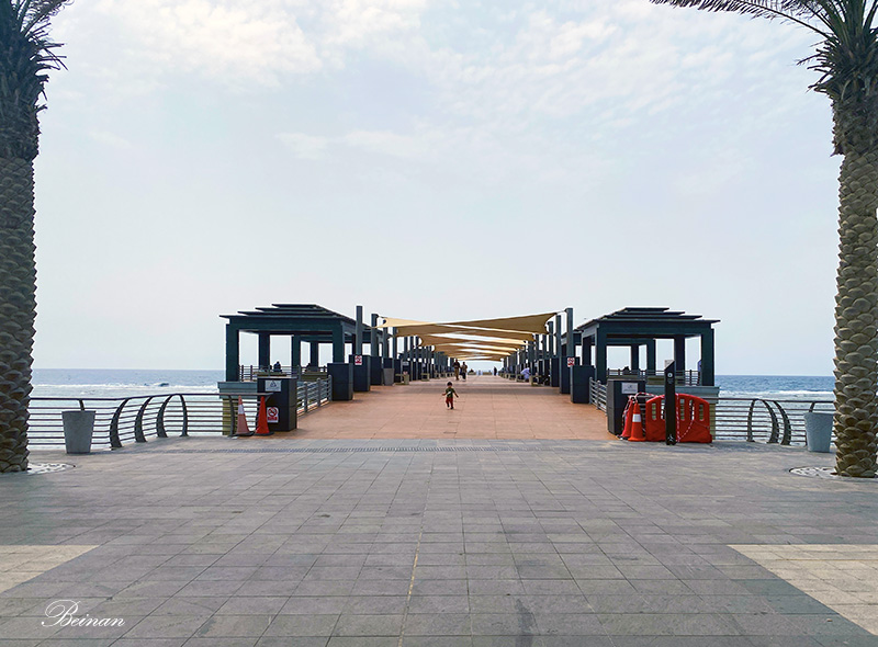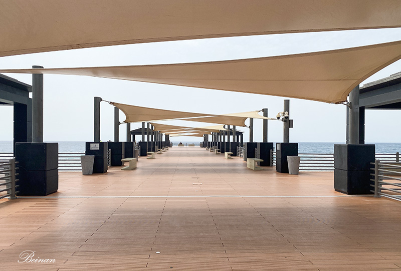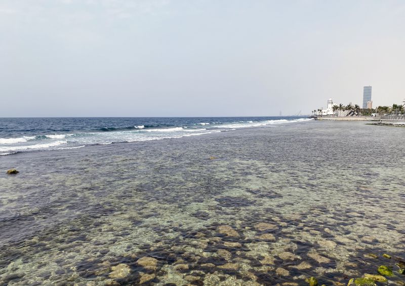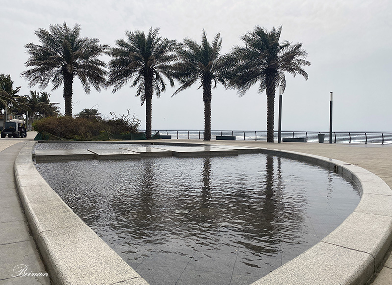 滨海路沿着红海岸边修建,有近30公里长。和吉达老城不同的是,滨海路干净宽阔,两旁绿树成荫,花草茂盛,环境清幽。沿岸设有休闲区、亭台楼阁和大型雕塑。