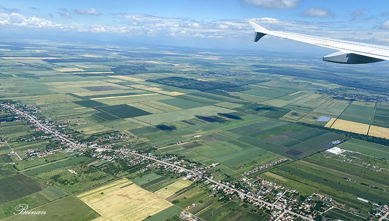 从飞机的舷窗往下看,布加勒斯特竟是这样一片平原。田野里深浅不同的绿色和黄色的几何形,构成了一幅美丽的图画。