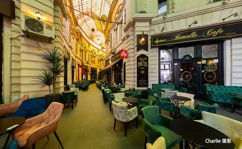 这是有名的马卡-维拉克罗斯通道(Macca-Villacrosse Passage)。这个通道有一段长长的历史和一个长长的故事,就不在这里唠叨了。看点是,这是一个覆盖着黄色玻璃屋顶的拱廊街道,是布加勒斯特一个很受喜爱的餐饮之地。