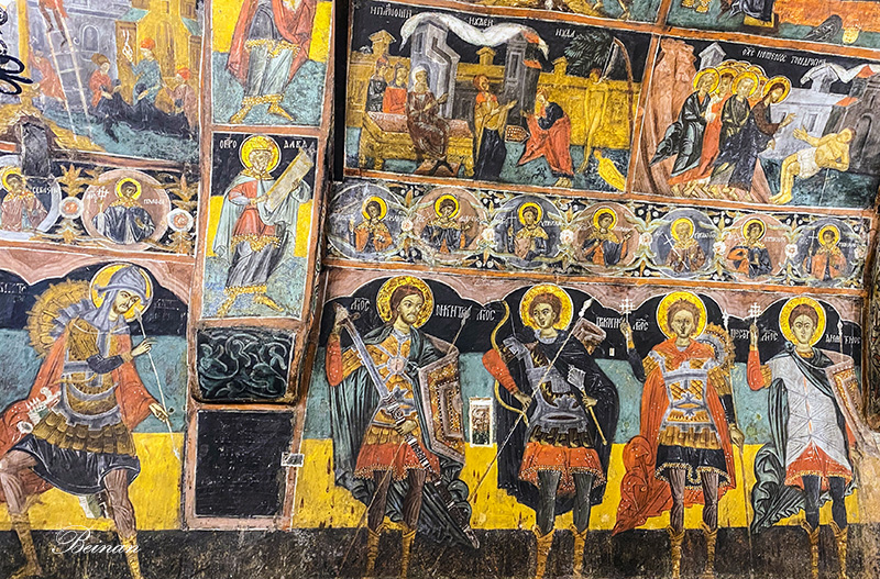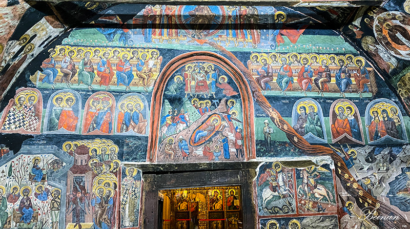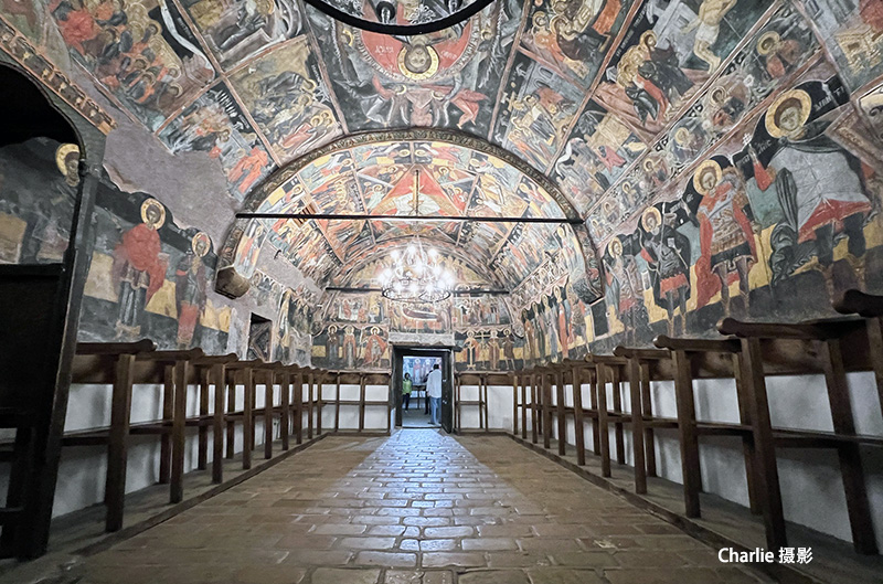 教堂里面所有的墙壁和顶棚,都被色彩鲜艳的壁画覆盖。这些壁画都是原始壁画,最早的画于1597年,有400多年历史了。