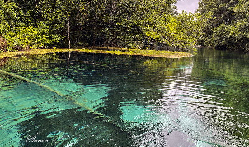 我们可以清晰地看到河底的白色的河沙或岩石。船夫让我们注意从那里出现的气泡。这就是泉水的来源,它来自罕见和神秘的地下通道,从湖东岸的加利奇卡山流出,注入奥赫里德湖。