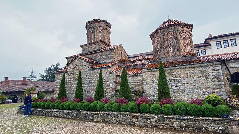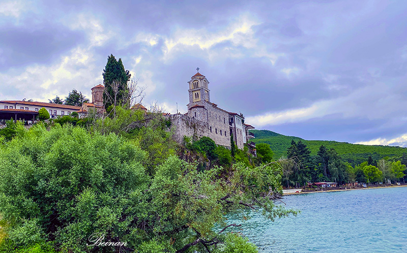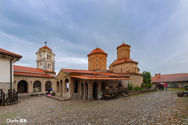 修道院建在山坡上,俯瞰奥赫里德湖。