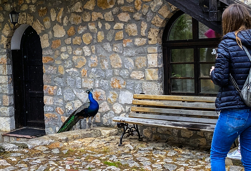 修道院了养了几只孔雀。它们可以在院子里自由自在到处跑动、飞翔,也不怕人。只是没有想到这么美丽的鸟竟会和那样可怕的叫声联系在一起。