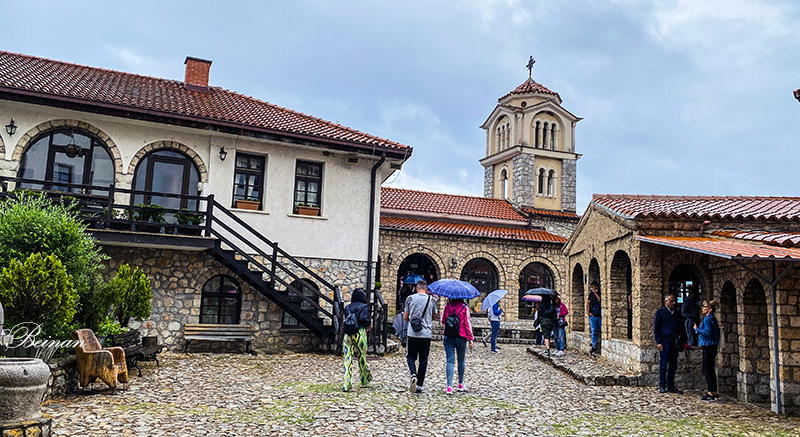 圣瑙姆修道院是北马其顿游客的重要打卡之地。尽管下着雨,还是有许多游客。