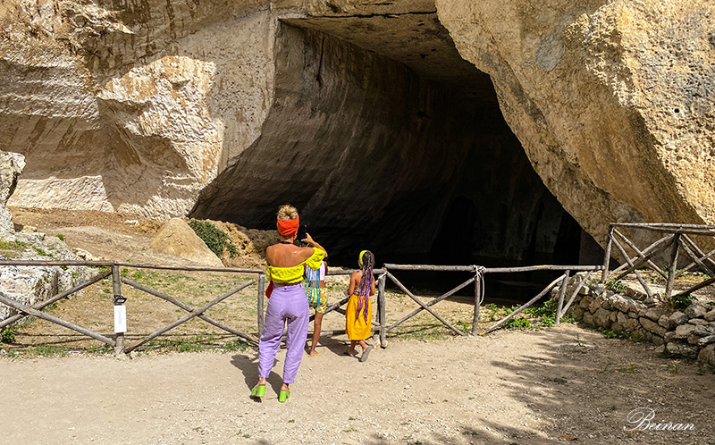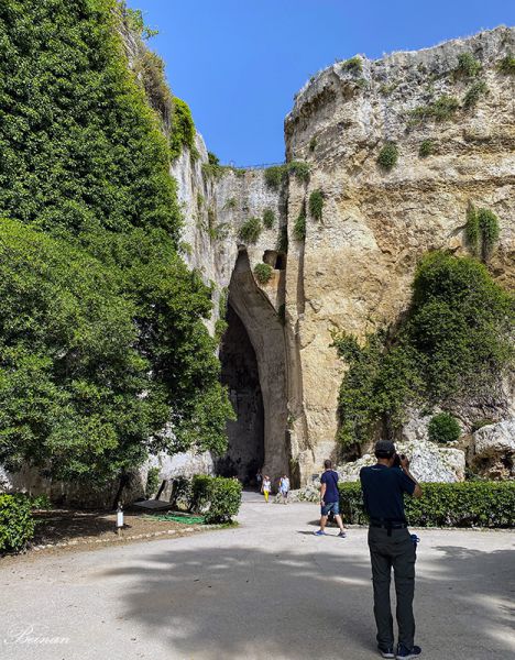 这个巨大的山洞被称为狄奥尼修斯的耳朵(Ear of Dionysius)。不仅仅因为山洞口的形状像只耳朵,还因为山洞有非凡的音响效果,站在一端,可以听到另一端的耳语。