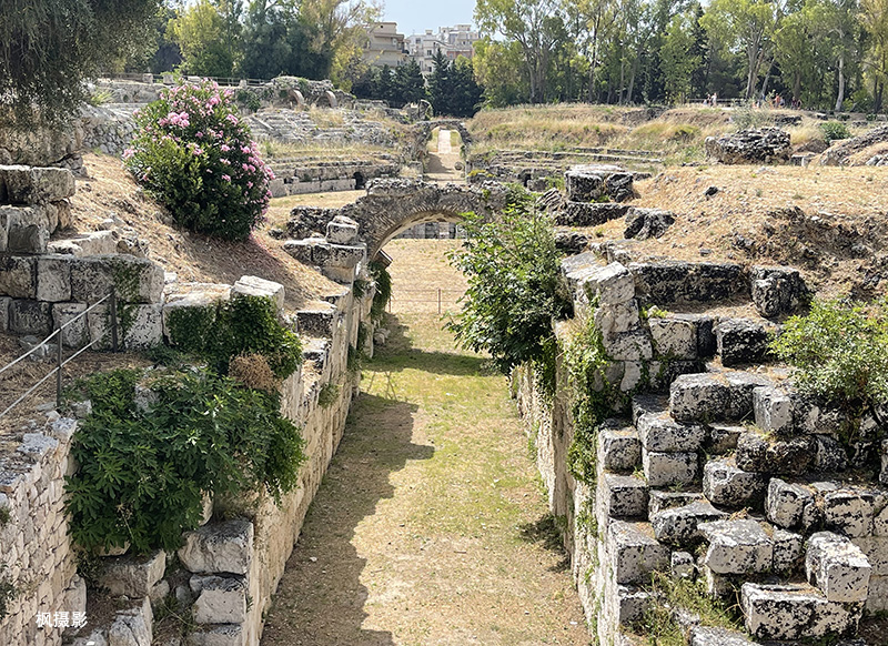 考古公园里还有一处罗马剧场遗址。这是一座圆形的剧场,建于公元1世纪。据说这里是锡拉库萨人在厌倦了希腊剧院的戏剧时举行血腥角斗士之类活动的地方。