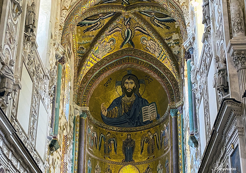 大教堂内部最值得看的是拜占庭风格的马赛克壁画。这是建筑教堂的罗杰二世从君士坦丁堡带来的马赛克艺术大师的作品。这些马赛克壁画覆盖了长老会、后殿和拱顶的墙壁。
