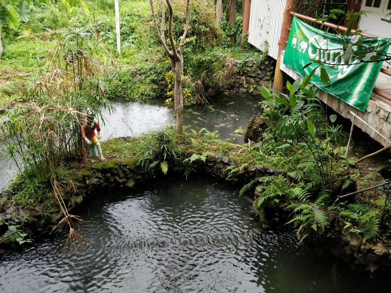 等着上菜,发现院里的水池养着很多鱼。带孙女、孙子看鱼: