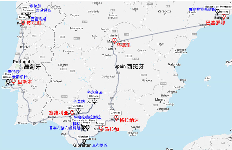 整个旅程18天。在西班牙的5个城市,葡萄牙的2个城市停留。两国境内乘了4次飞机,2次火车。加上几个主要城市周边小城及景点的一日游。所有这些地方的住宿、机票、火车票、一日游/半日游的预定、以及各地接机送机的安排,等等,一件件搞定,也足以令人头昏目眩了。