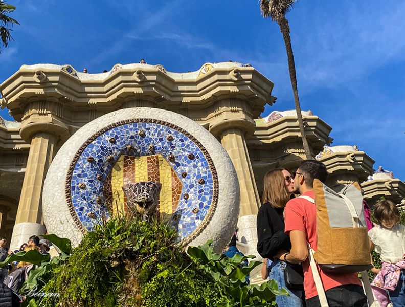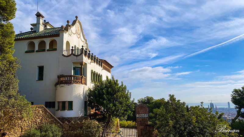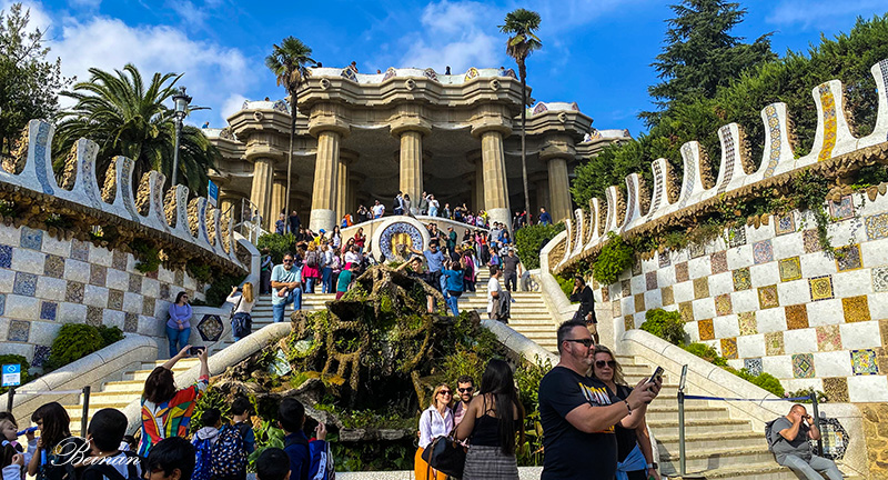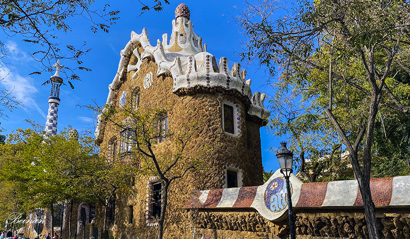 先去看桂尔公园(Park Güell)。桂尔公园是巴塞罗那著名的打卡之地。远远地就看到公园入口处的高迪建筑风格的小楼和尖塔。