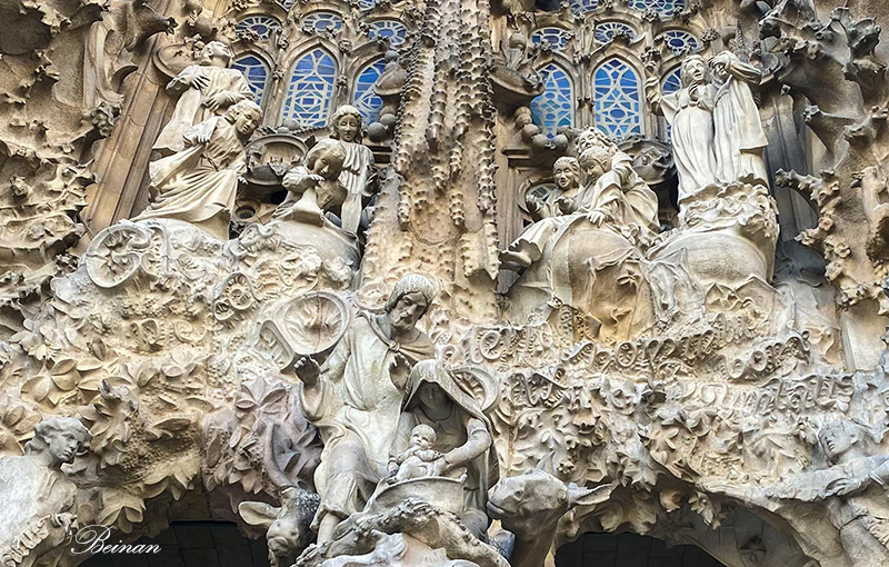 圣家堂共有三个立面。每一个立面上都有无数精致的雕塑,讲述耶稣的一生。教堂前面的立面是耶稣诞生。