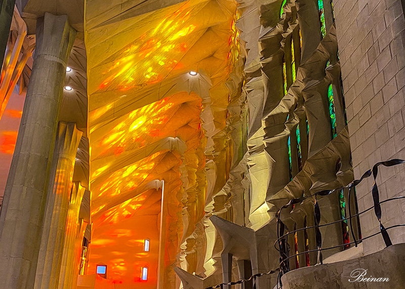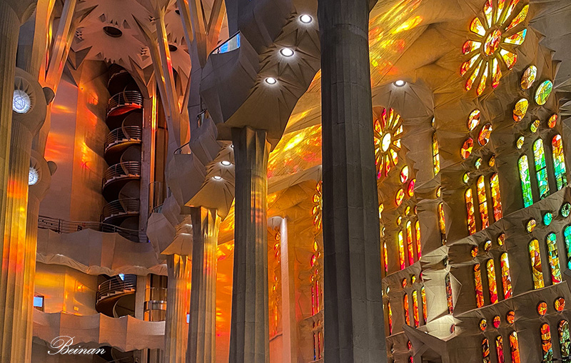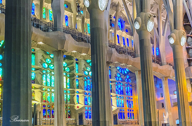 高迪巧妙地利用自然光和灯光的设计,使教堂看起来像天堂一样。西班牙的阳光透过彩色玻璃倾泻而入,营造出令人眼花缭乱的绚丽多彩。