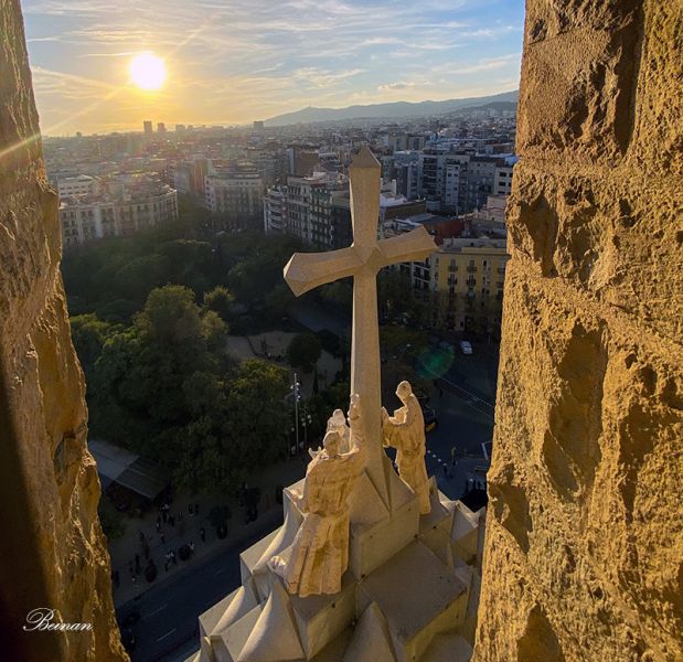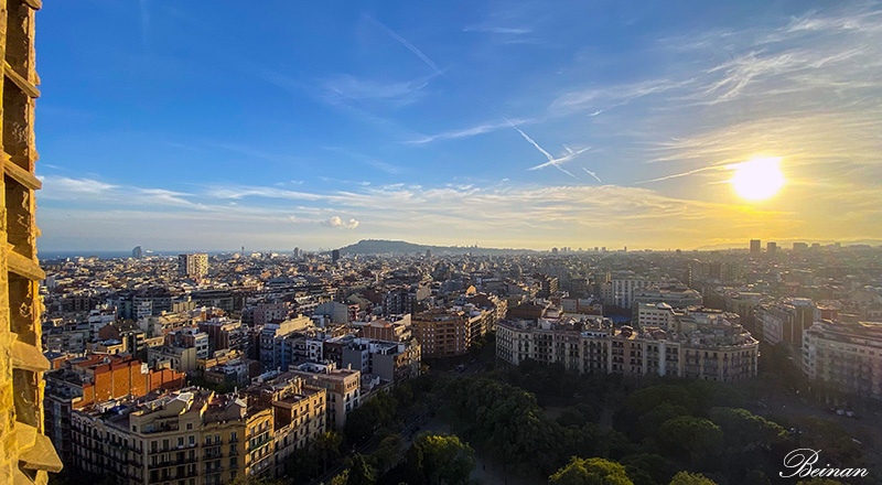 登上圣家堂18个塔楼中的一个,俯瞰夕阳中的巴塞罗那。