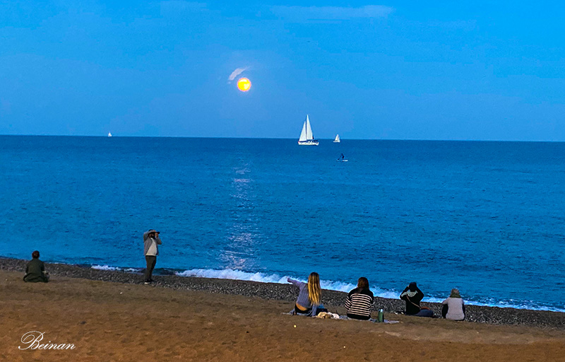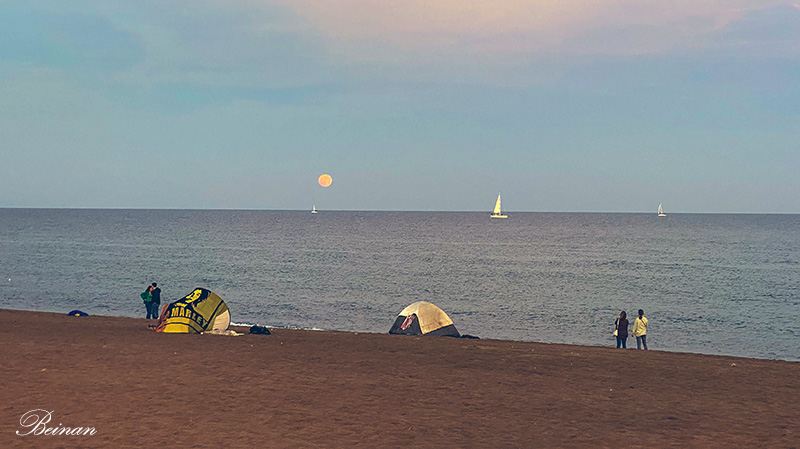 照耀着海上的白帆,岸边的帐篷,白色的海浪,和观海赏月的人们。