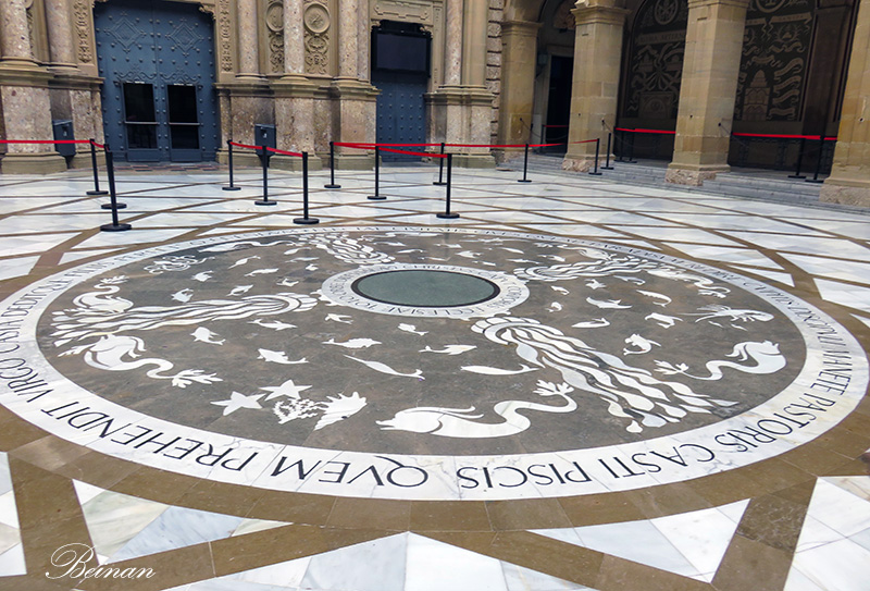 教堂门前庭院中的大理石地面。圆圈中有许多鱼类。导游讲解说,天主教的鱼象征着耶稣,也象征着神圣的能量。圆圈代表着能量是从中心散发出来的。