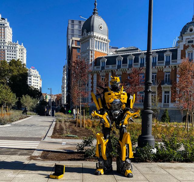广场上站立着要钱的变形金刚。路过时,他突然动了起来,老太还着实吓了一跳。
