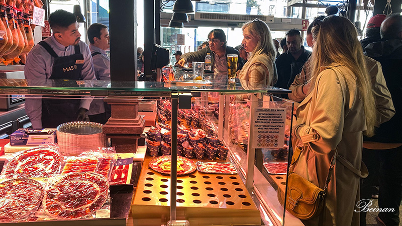 市场内人声鼎沸,拥挤不堪。在这里,可以品尝到来自西班牙不同地区的最好的美食,从用加利西亚海岸最新鲜的鱼和海鲜烹制的小吃到来自各地的各种美味奶酪,还有肉类、水果、蔬菜和蛋糕等等。