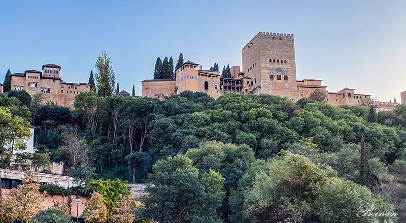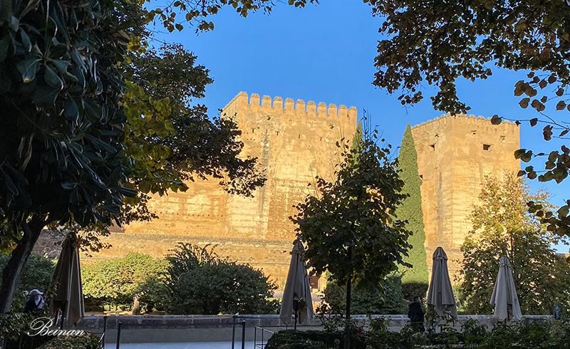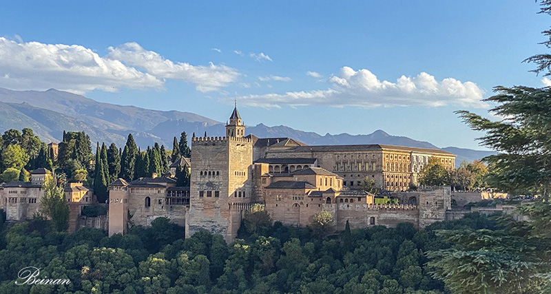格拉纳达位于内华达山麓(Sierra Nevada)。阿尔罕布拉宫则坐落在一个高高的山丘上。起初,它只是一个堡垒,主要用于防御。