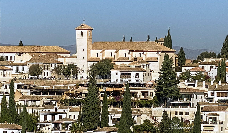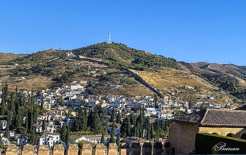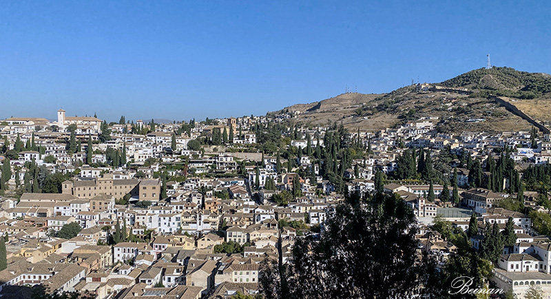 镜头拉近,看到对面山坡上的阿尔拜辛阿拉伯区。那是我们头天光顾的地方。还可以依稀看到圣尼古拉斯观景台上的人群。