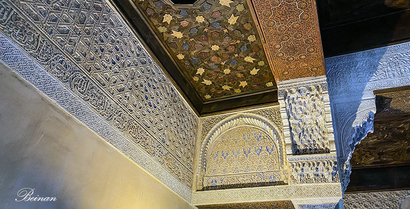 大厅里到处是装饰性的铭文,其中有诗歌,有对上帝的赞美,还有纳斯里德人的座右铭或古兰经文本。对俺来说,阿拉伯文字就是美丽的图画,百看不厌。